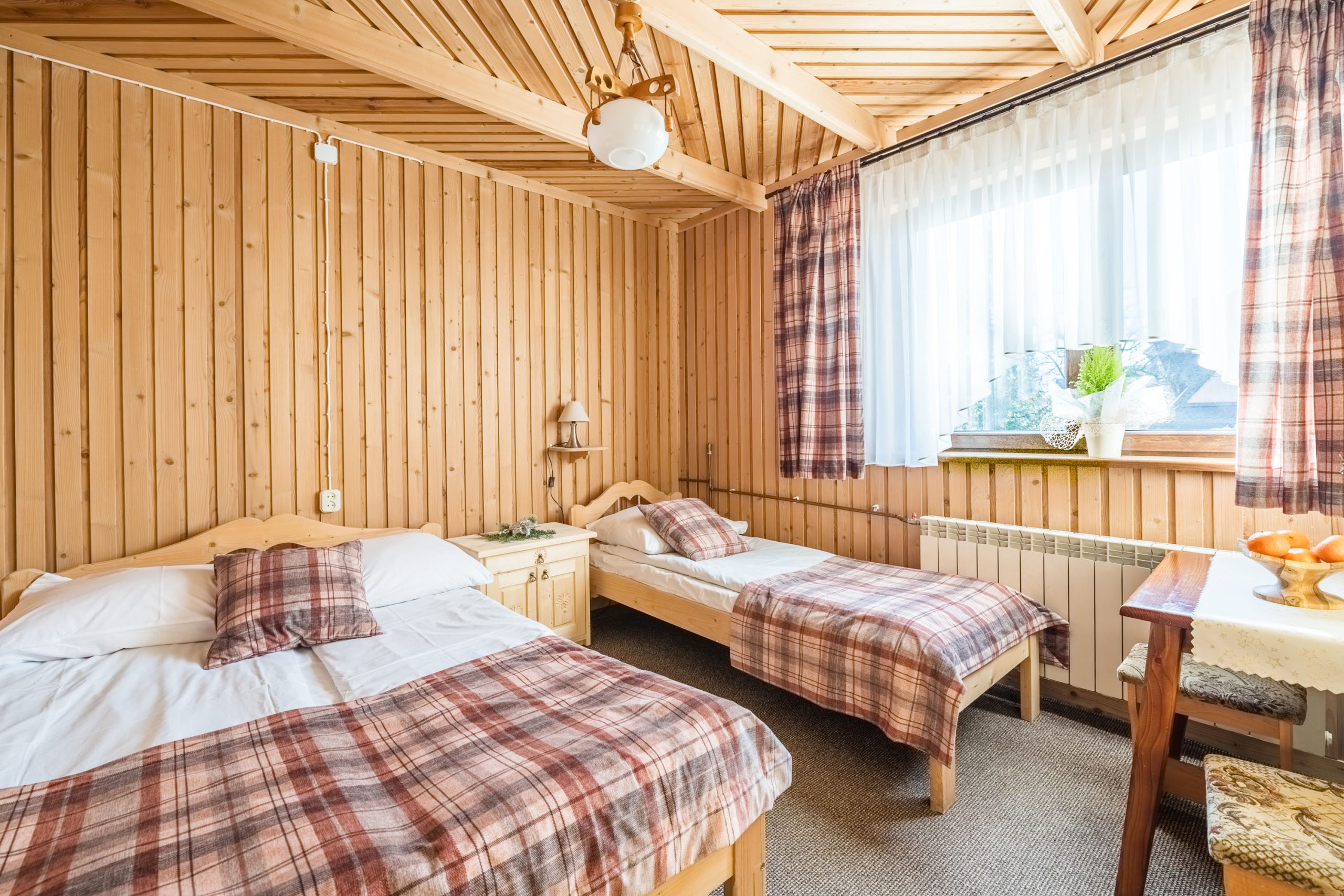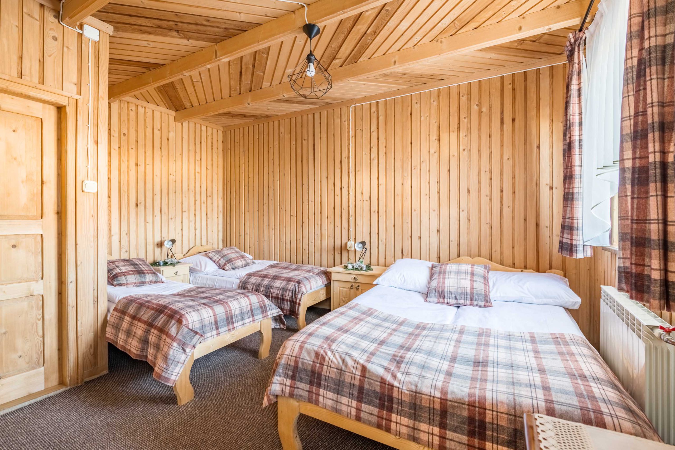 W każdym pokoju znajduje się łóżko małżeńskie i jedno lub dwa dodatkowe łóżka.
