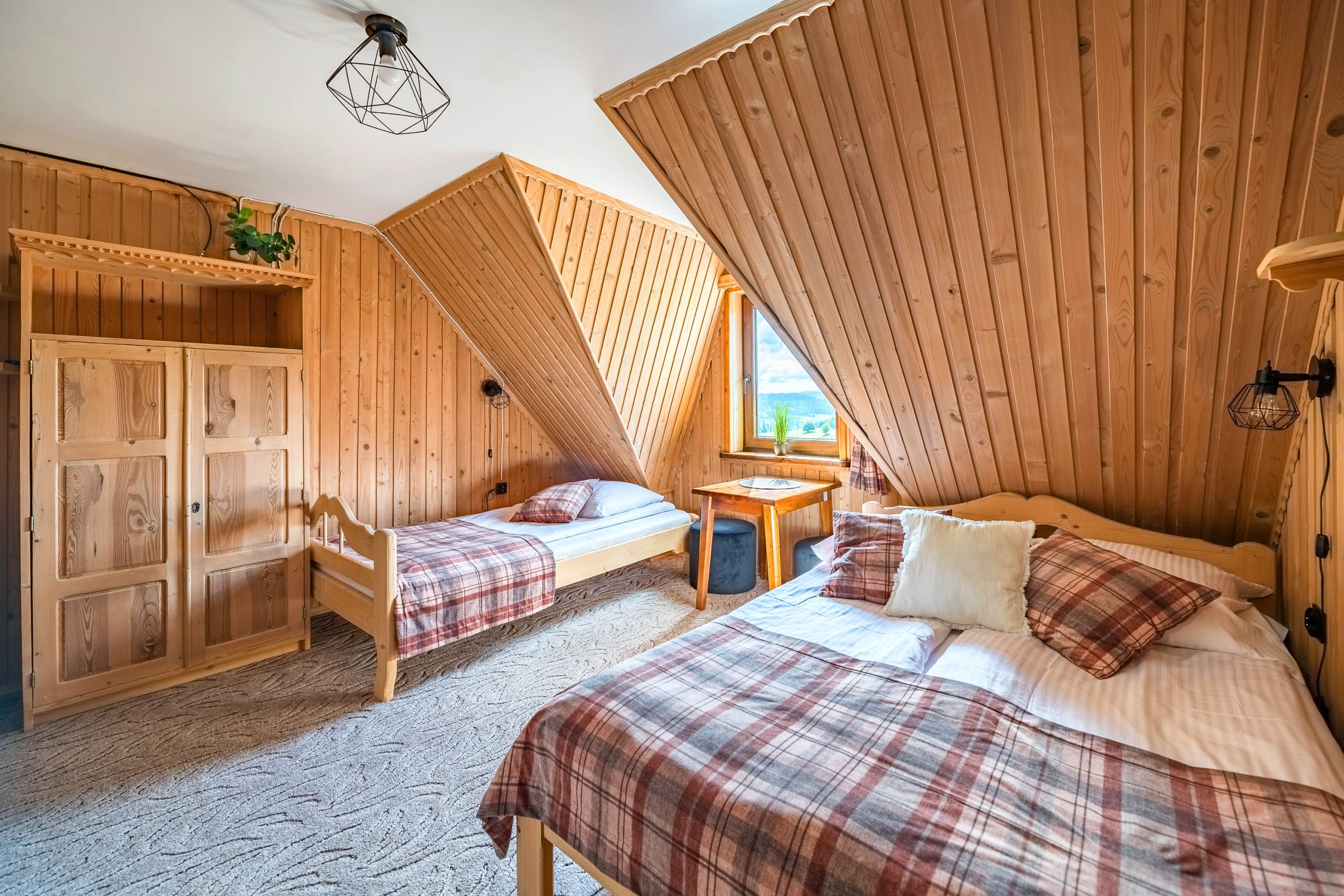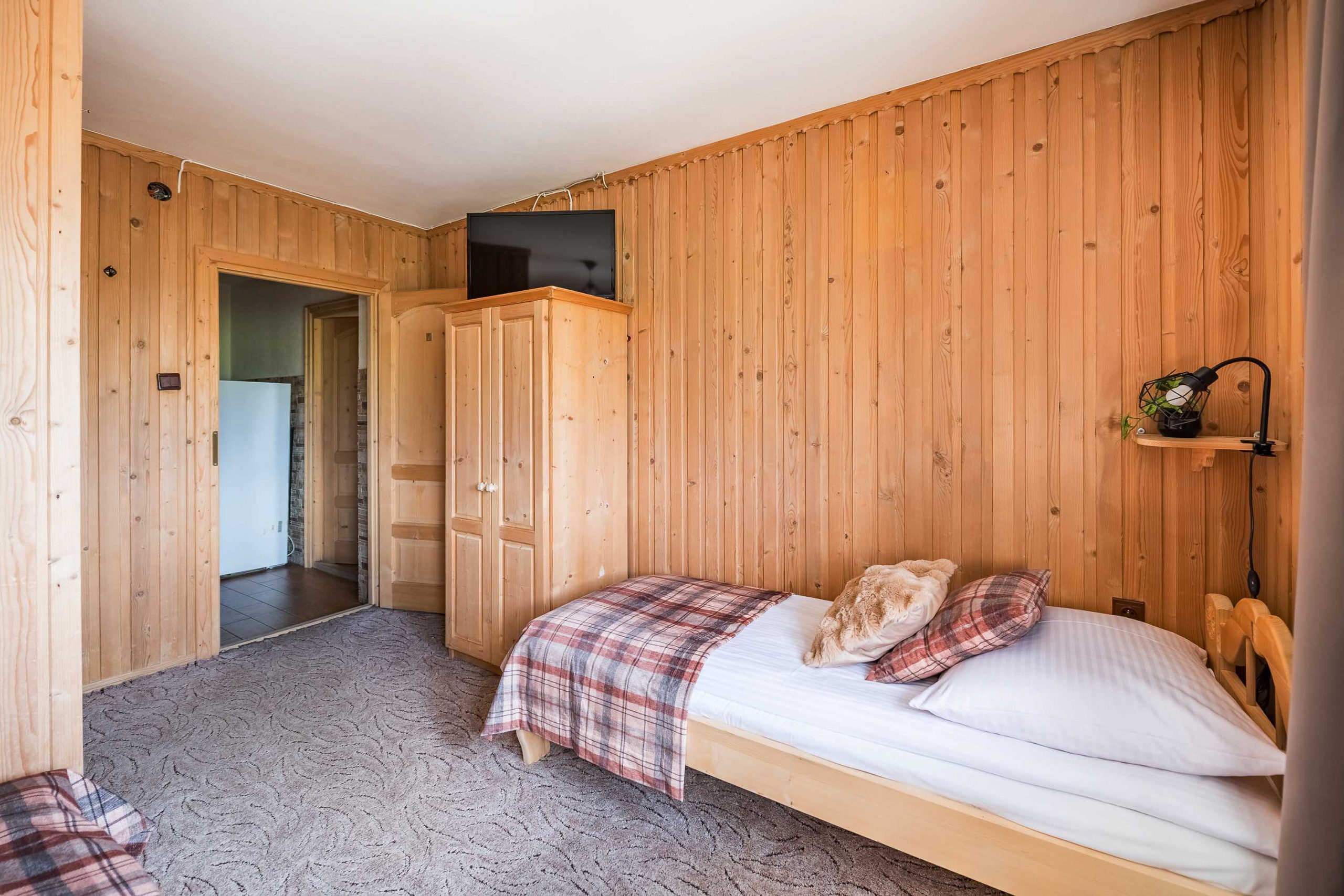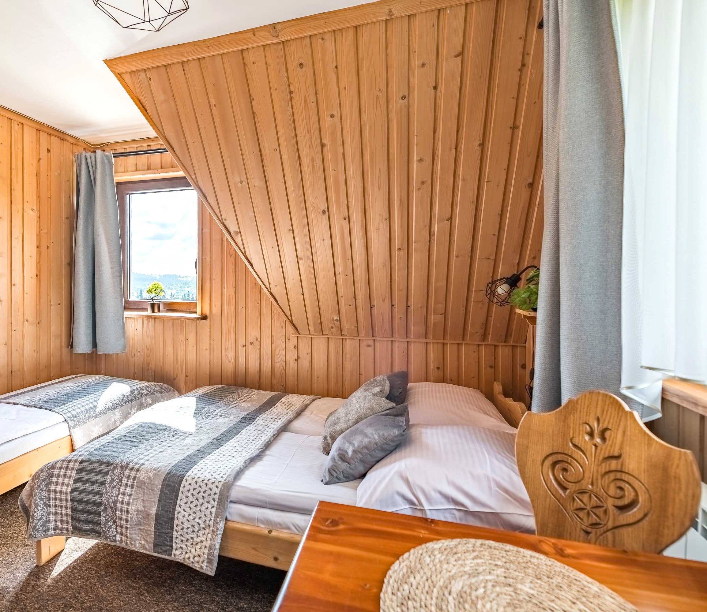 W jednym pomieszczeniu znajduje się łóżko małżeńskie i jedno pojedyncze, zaś w drugim dwa pojedyncze łóżka.