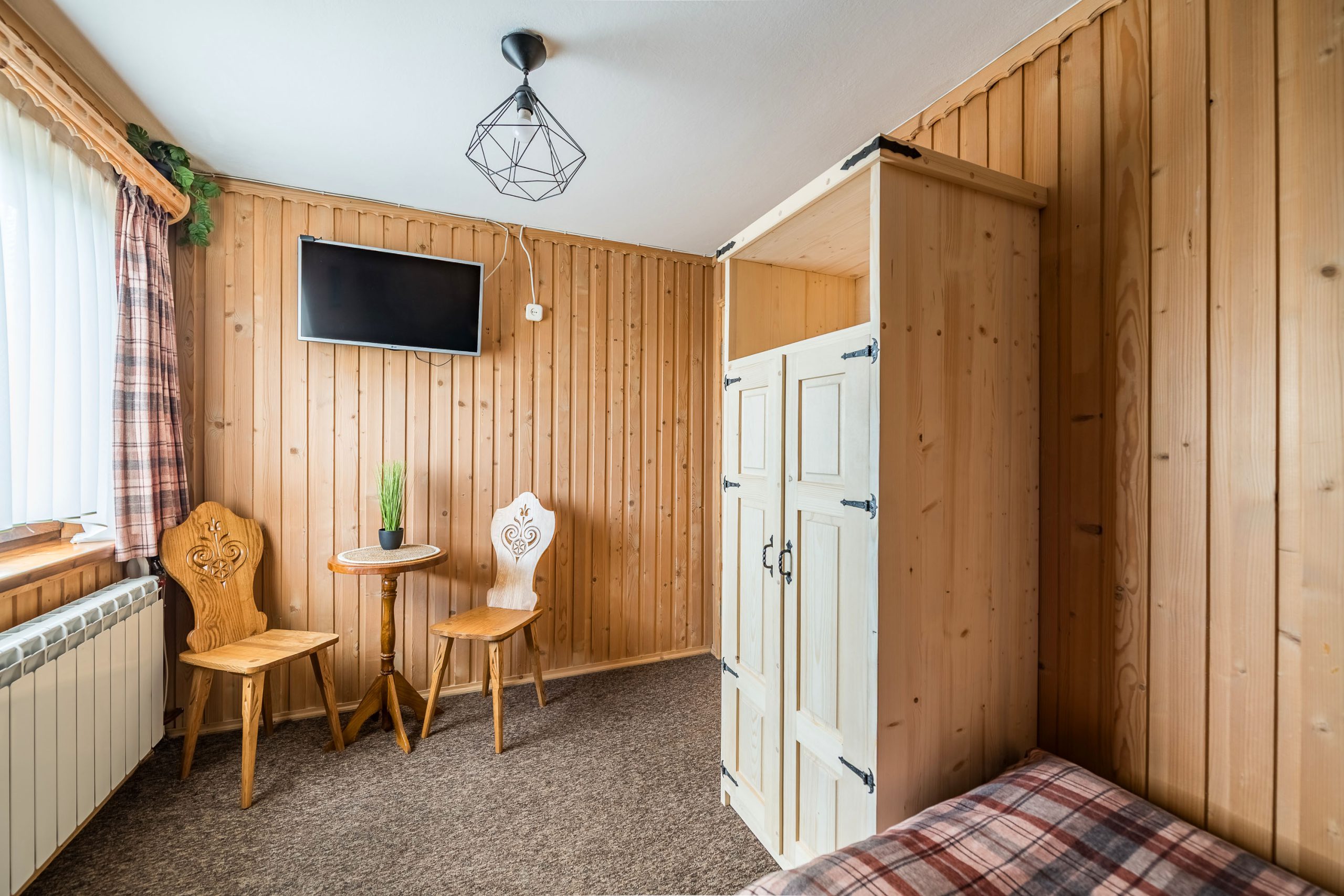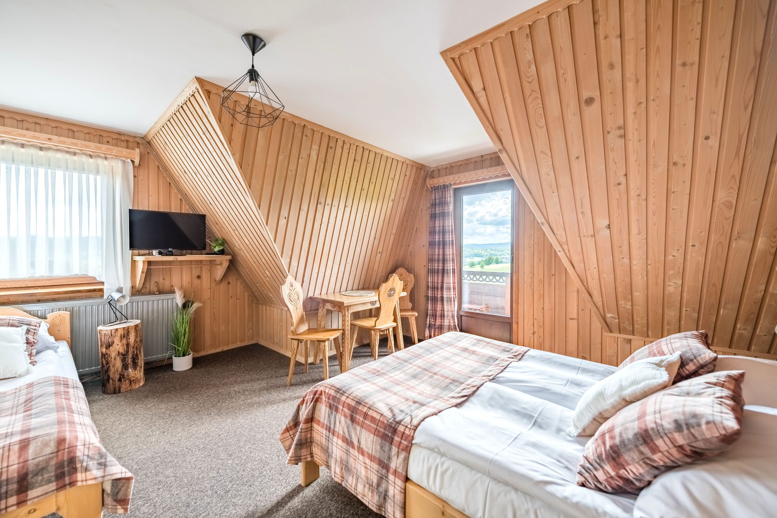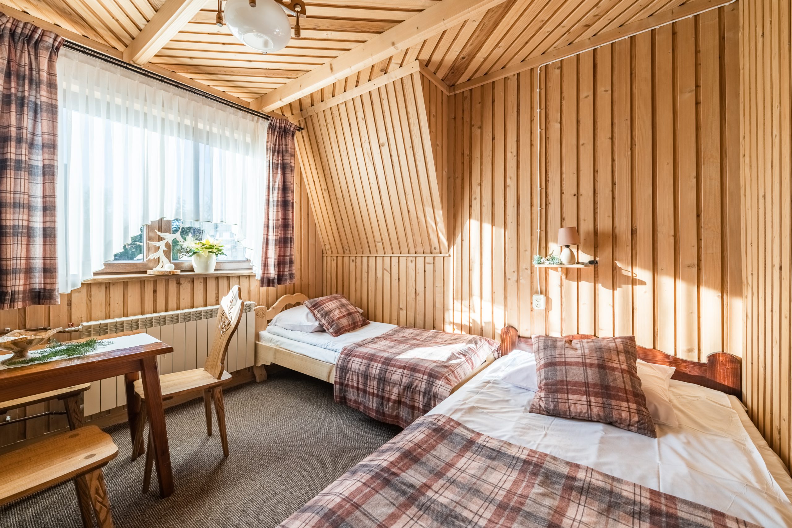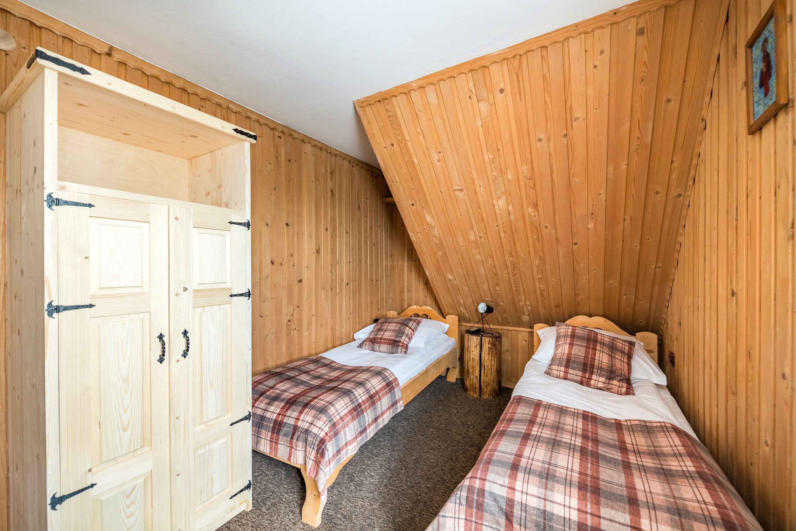 W jednym pomieszczeniu znajduje się łóżko małżeńskie i jedno pojedyncze, zaś w drugim dwa pojedyncze łóżka.