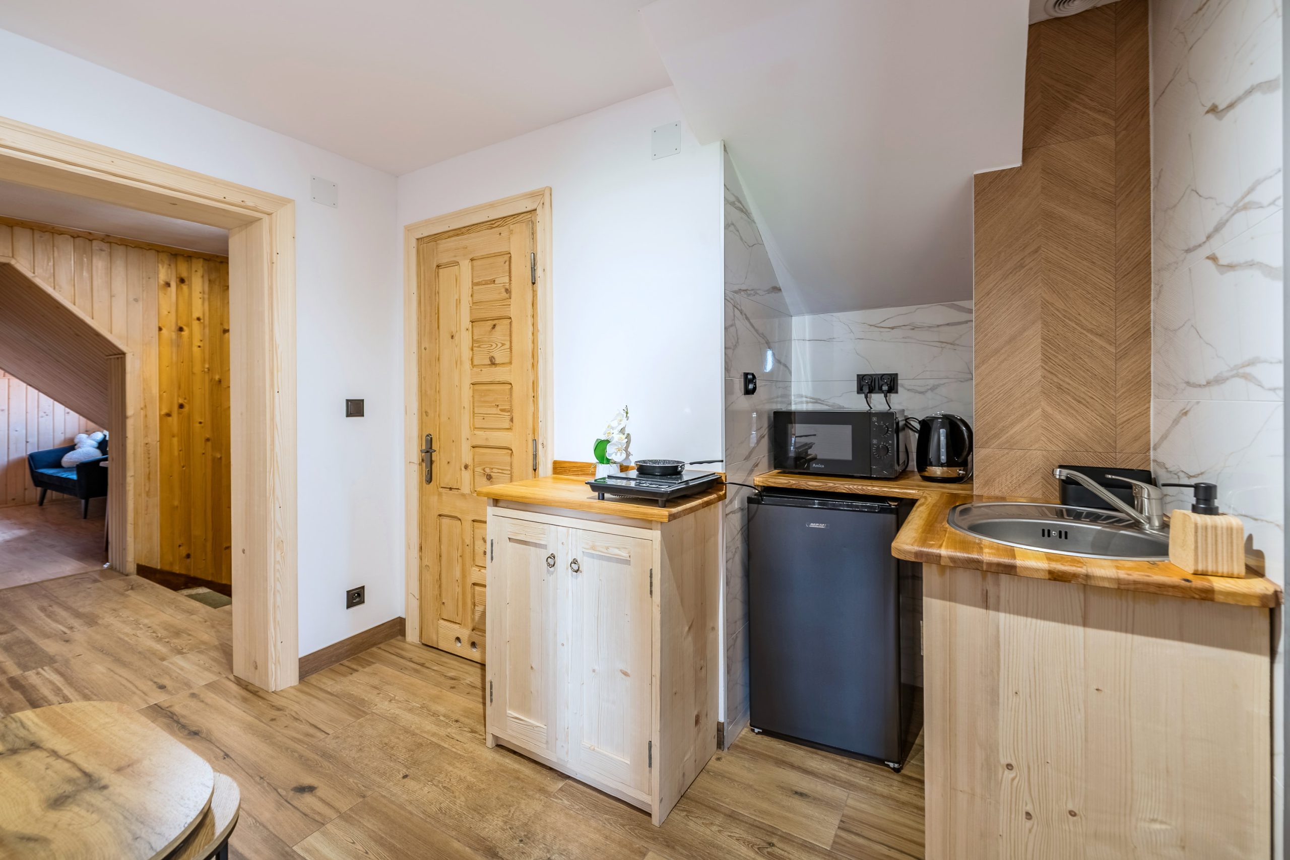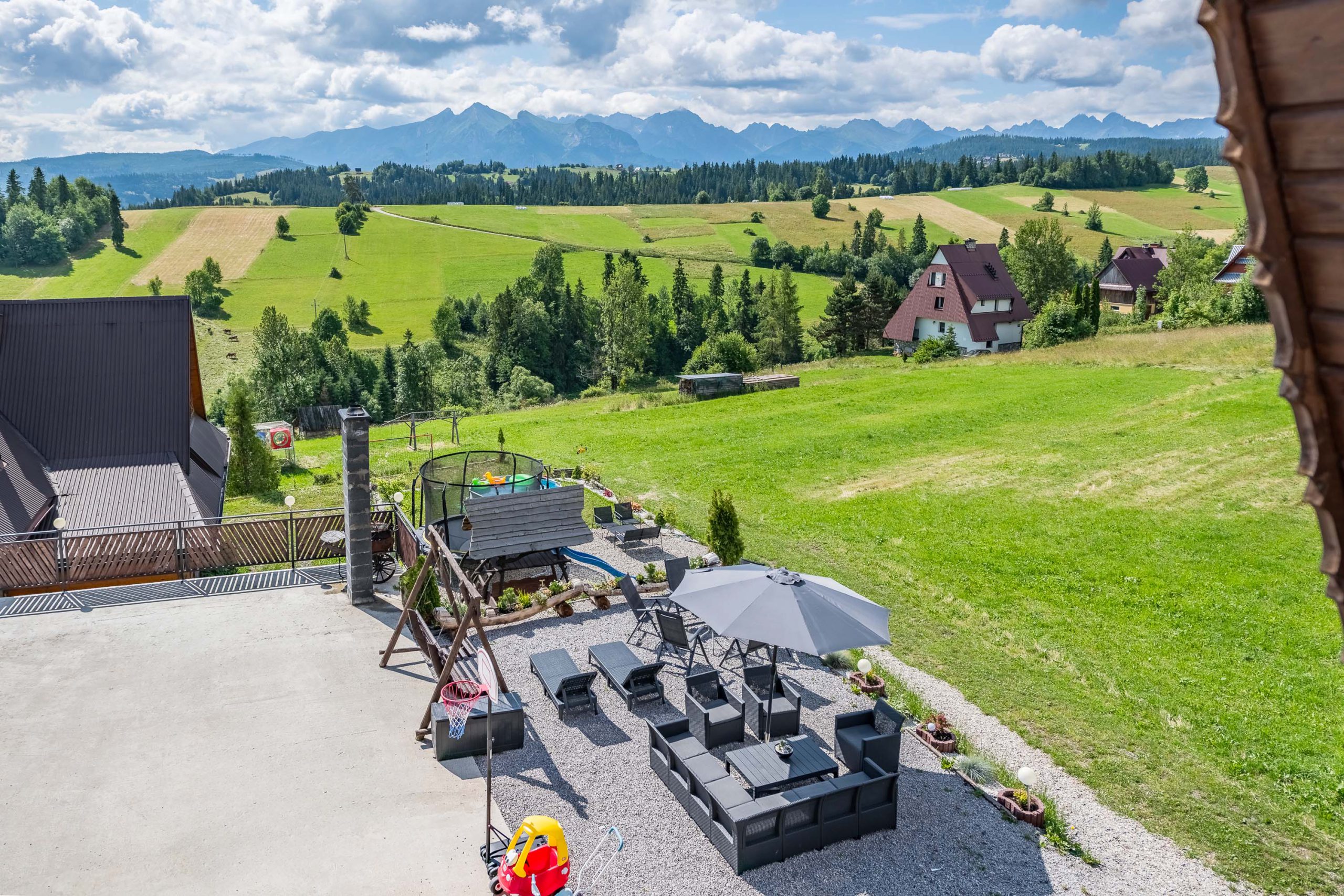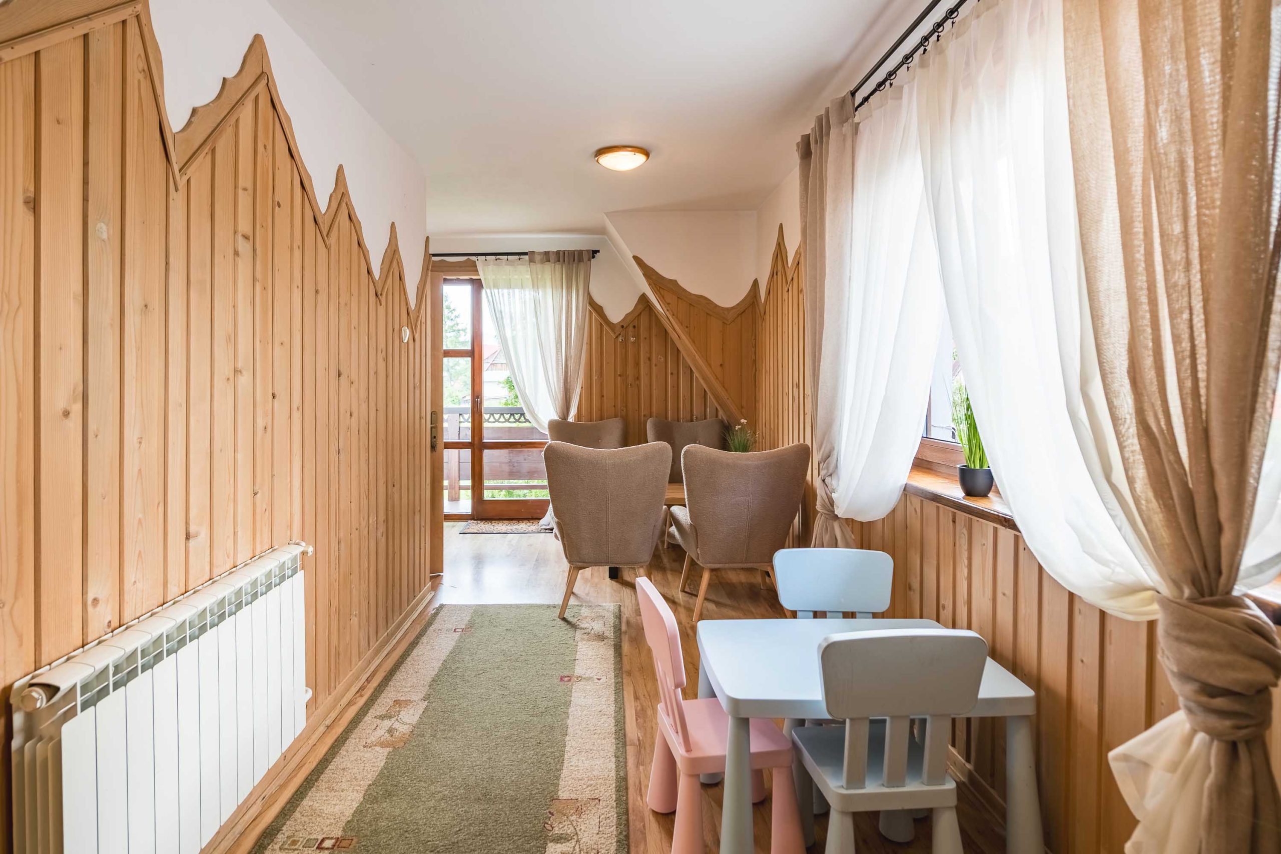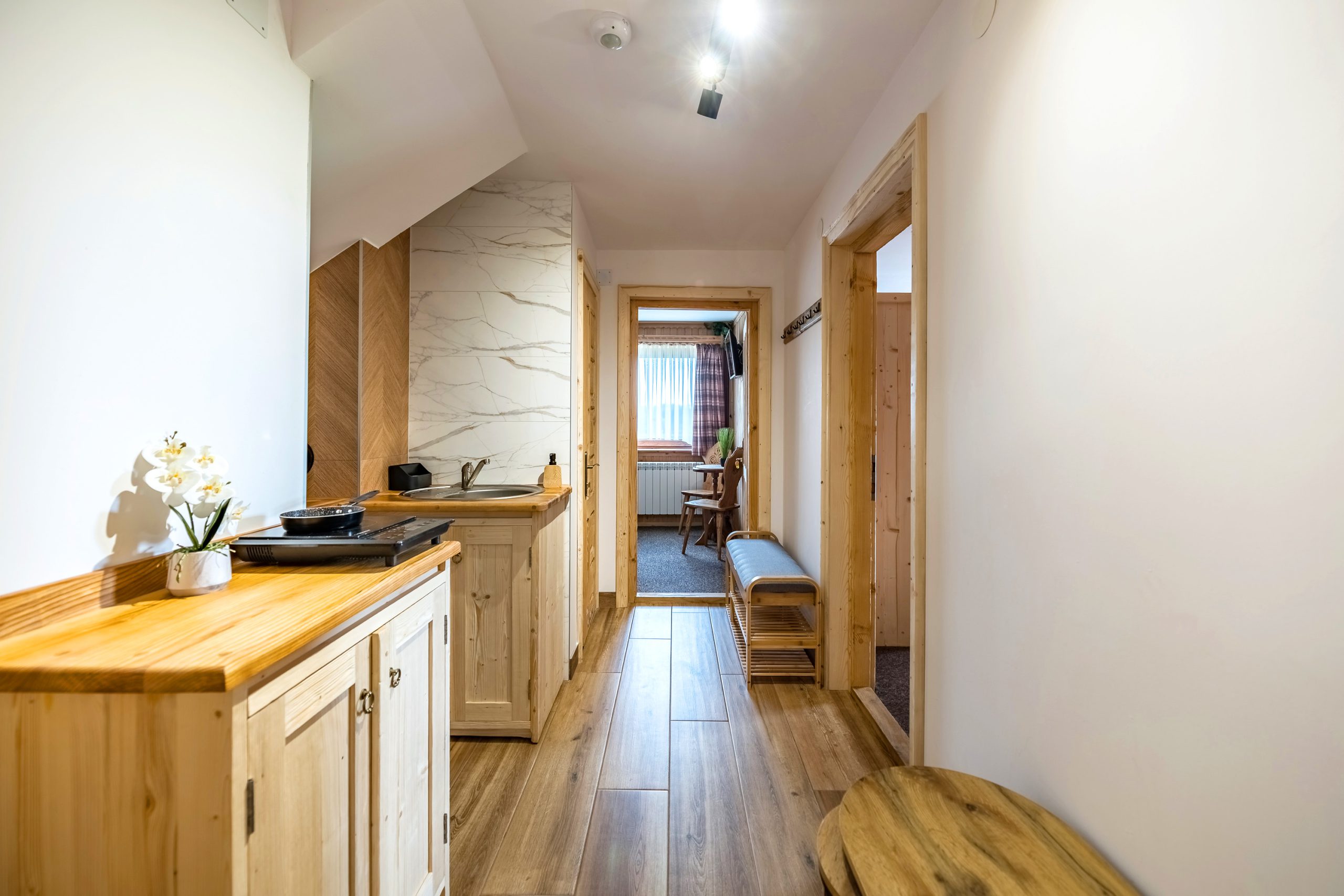 Są to dwa pokoje połączone wspólnym korytarzem. Z balkonu jednego z pokoi roztacza się piękny widok na całą panoramę Tatr.