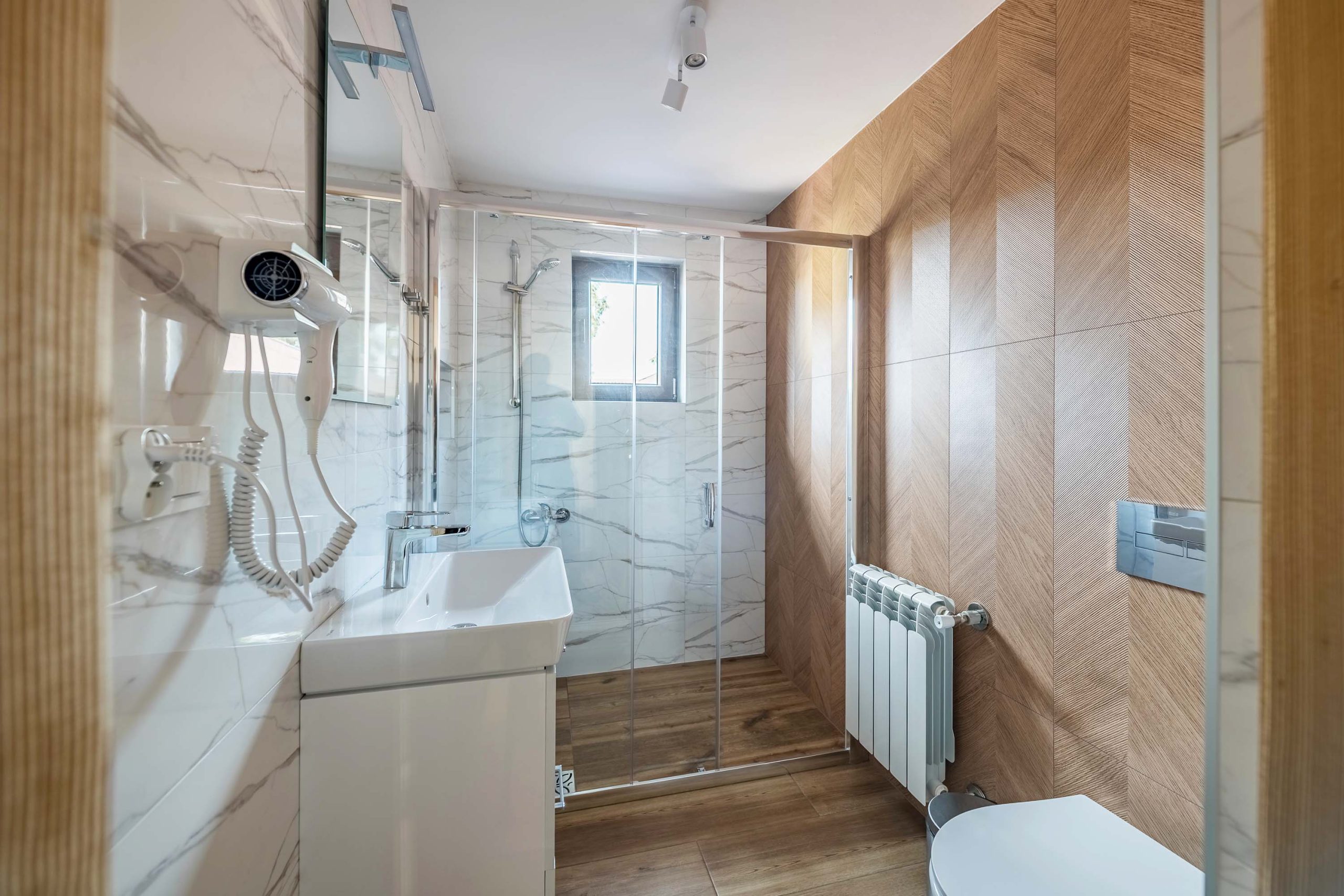 W przedpokoju jest łazienka z prysznicem ,suszarką do włosów i ręcznikami.